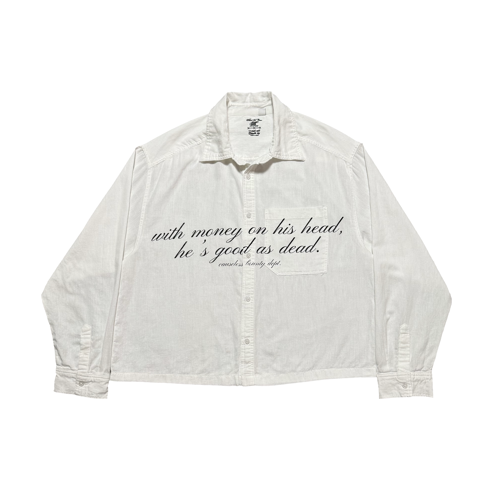 Without A Cause Boxy Button Up with “With Money On His Head, He’s Good As Dead” print. We recommend going true to size as our button-ups are always preshrunk and fit slightly oversized. We always recommend machine washing in cold water and air drying to keep the garments in great condition. All sales are final due to the limited quantity; check out with the correct sizes and items.