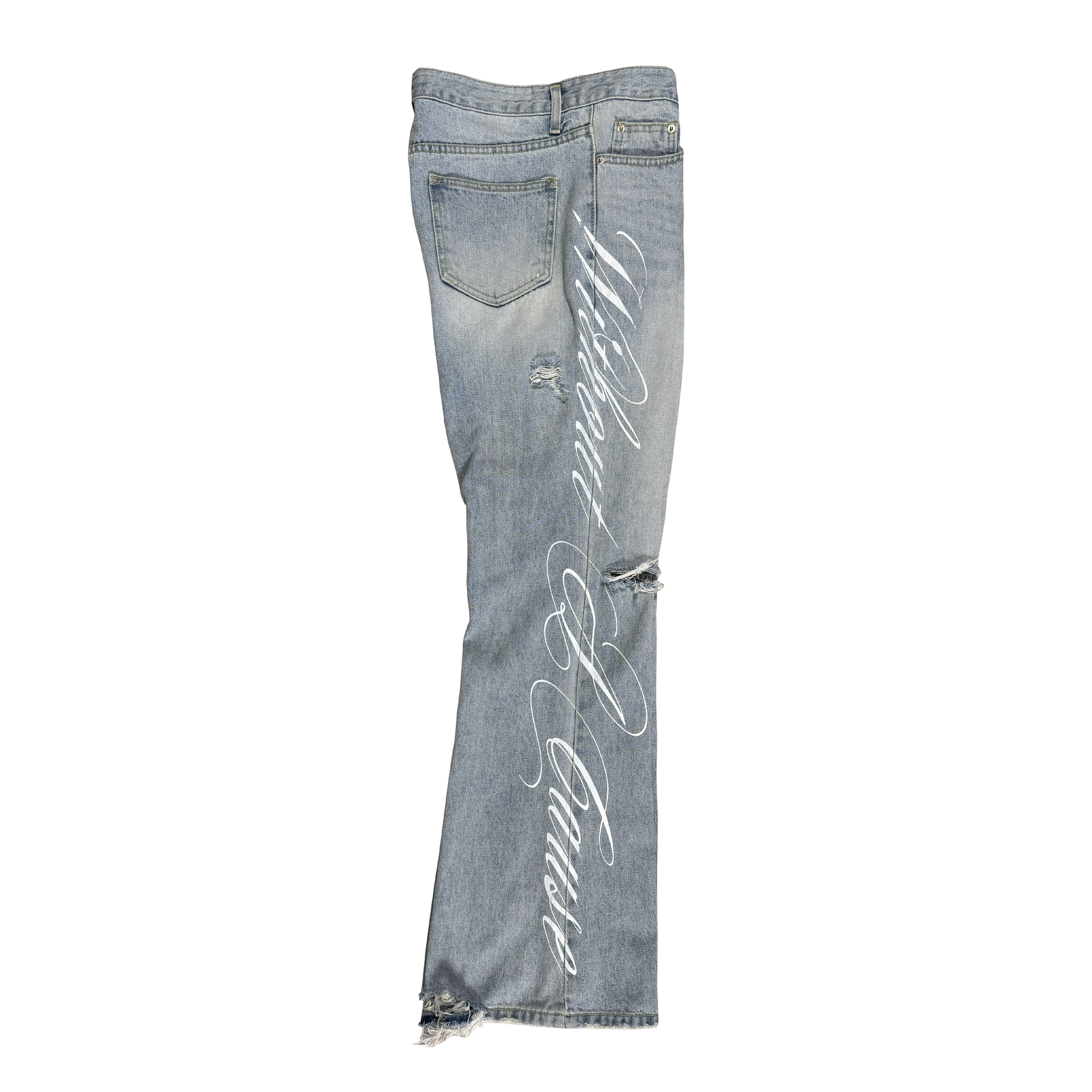 Without A Cause cursive print flare jeans.